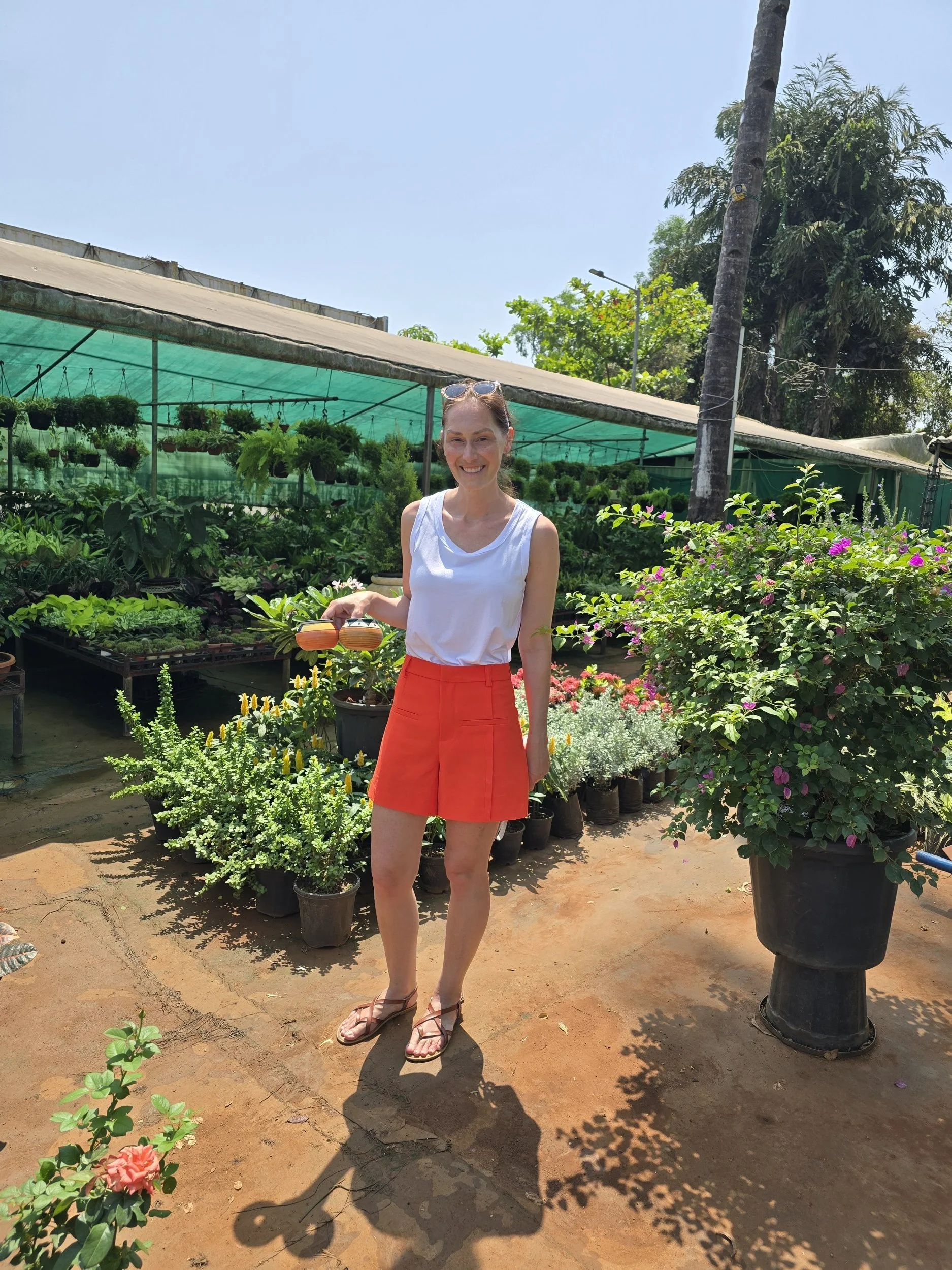 Today we totally relaxed. We had a delicious breakfast complete with Indian Chai Tea. It's made from cardimun seeds. This spice is balanced with warm milk and sugar. I could be persuaded to replace my coffee adiction with it...that is saying something. Fierce and I sat under the canopy by the pool afterwards. I painted and then Carmen came to visit for a while. She loves animals and when a grasshopper hopped on her arm, I grabbed a quick photo. At some point, Fierce went back to the room and I decided to see if the local greenhouse had any marigold seeds. The taxi driver thought I was crazy..."Why don't you buy them online?" I laughed, "Because then, the seeds wouldn't be from India!" He made sure that I understood that he didn't think we would find any and I reassured him that was ok. The first stall was a flower stand and no luck. The second stop was a greenhouse. They didn't have any seeds, but they did have some adorable little plant pots so I said that is a great souvenir substitute. The taxi driver took my picture and I think I won 'craziest tourist award' for the week and maybe month.