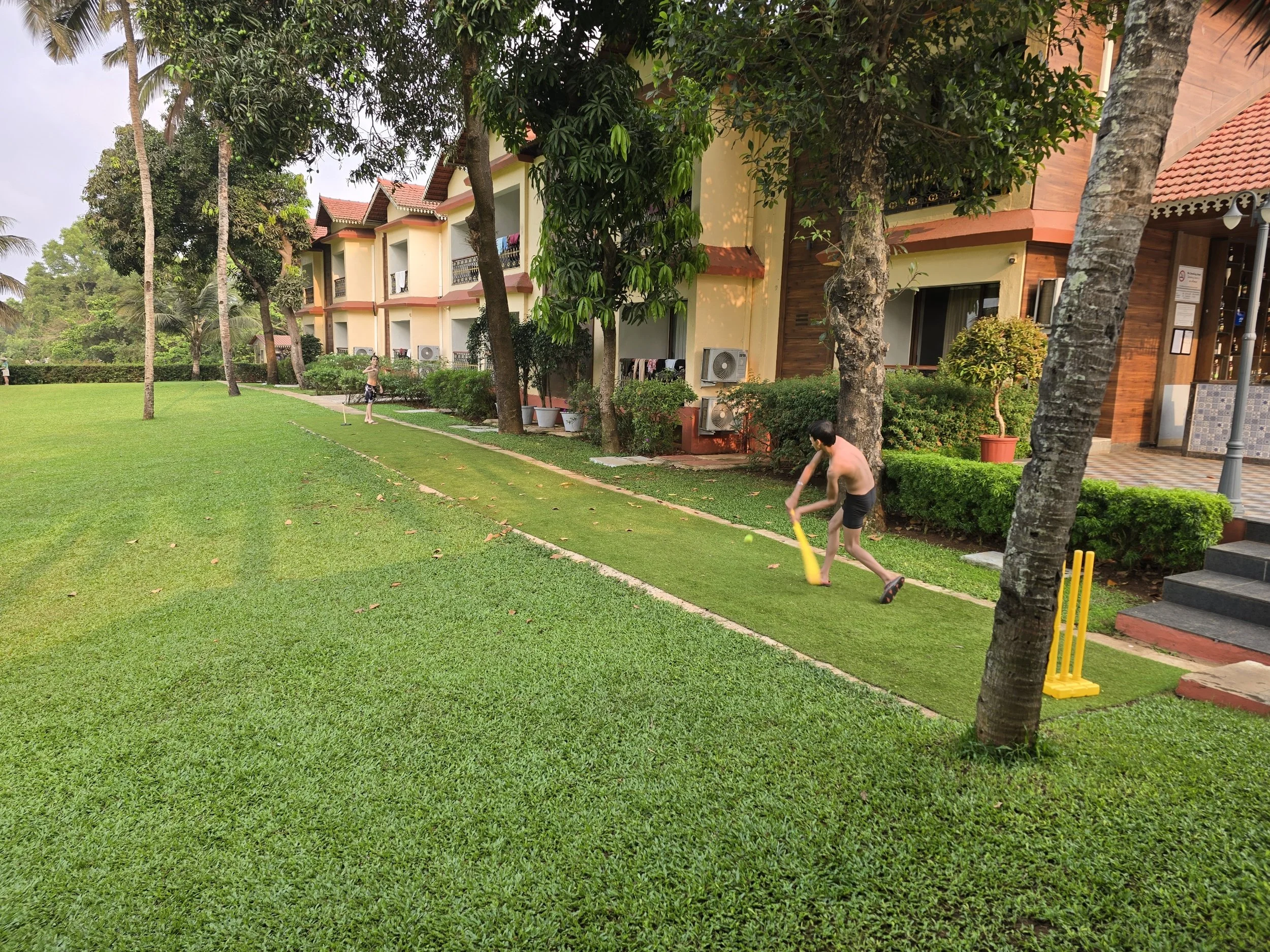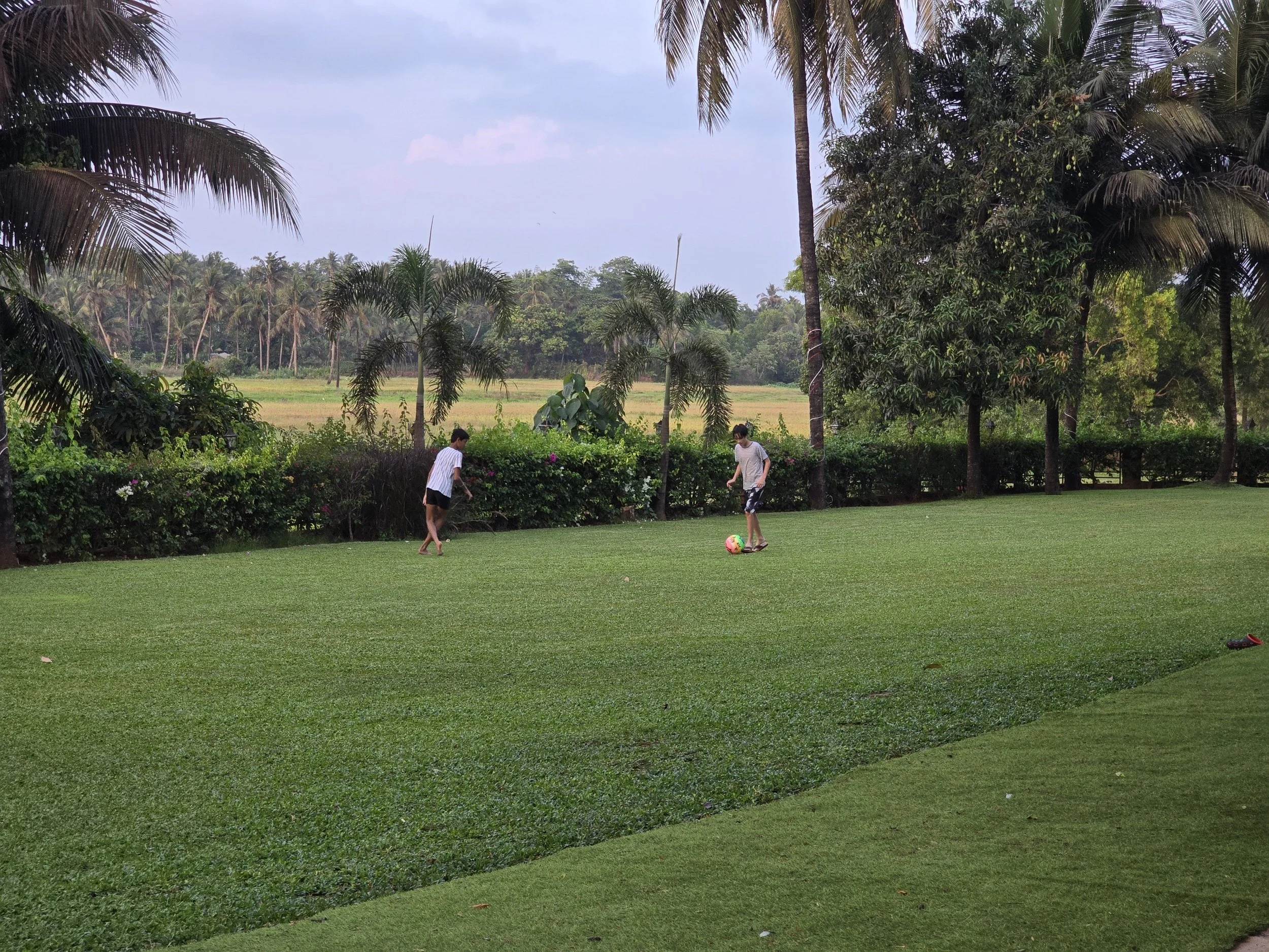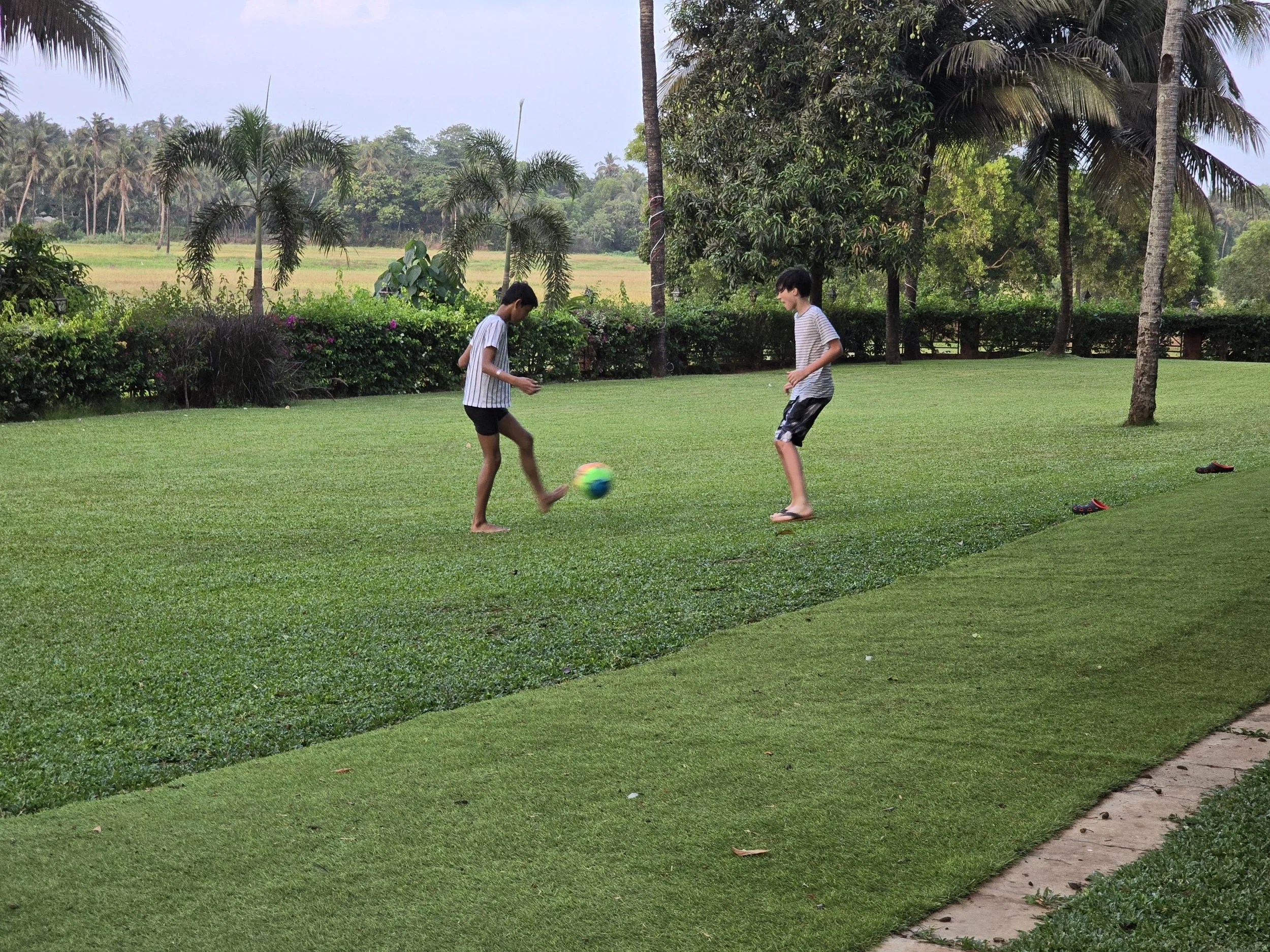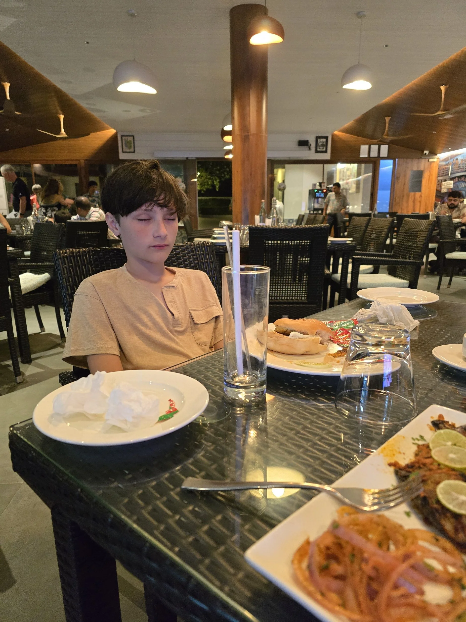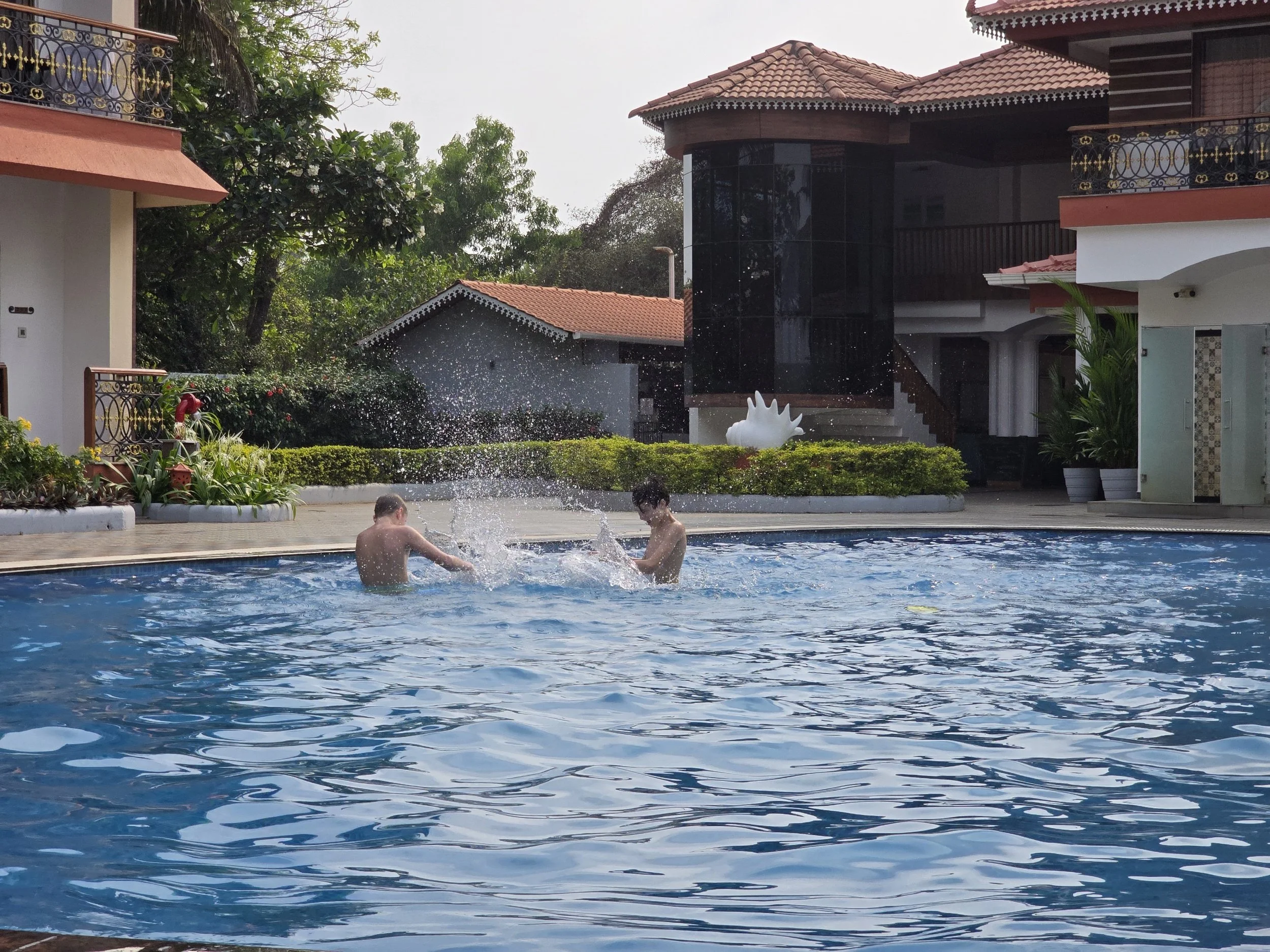 After checking in, we walked through the pool area and little cottage-like rooms set up in a sort of u-turn shape until we found ours. All of the paths are lush with flowers and greenery. It's like a little oasis. Our room has everything we need and is just right, but we couldn't wait to "Do Not Pass Go" and get in the pool! Warm water welcomed my traveled self. Fierce made friends with a shy Russian boy and soon they were having epic water fights. Then an Indian boy saw the fun from afar and he was adorable to watch. At first he came down from his balcony overlooking the pool with his sister and played cricket in the yard with her. A bit later, he returned with his suit and was inching over to the boys. Finally, Fierce noticed and said, "Hi" and the rest was plain old fun for all three. The Russian boy had to go, but another Indian boy arrived and Fierce was in that pool for more than four hours. We sat down in the café next to the pool for dinner and half way through his chicken burger he fell asleep at the table! I think it was a good day. Thank you, Lord.