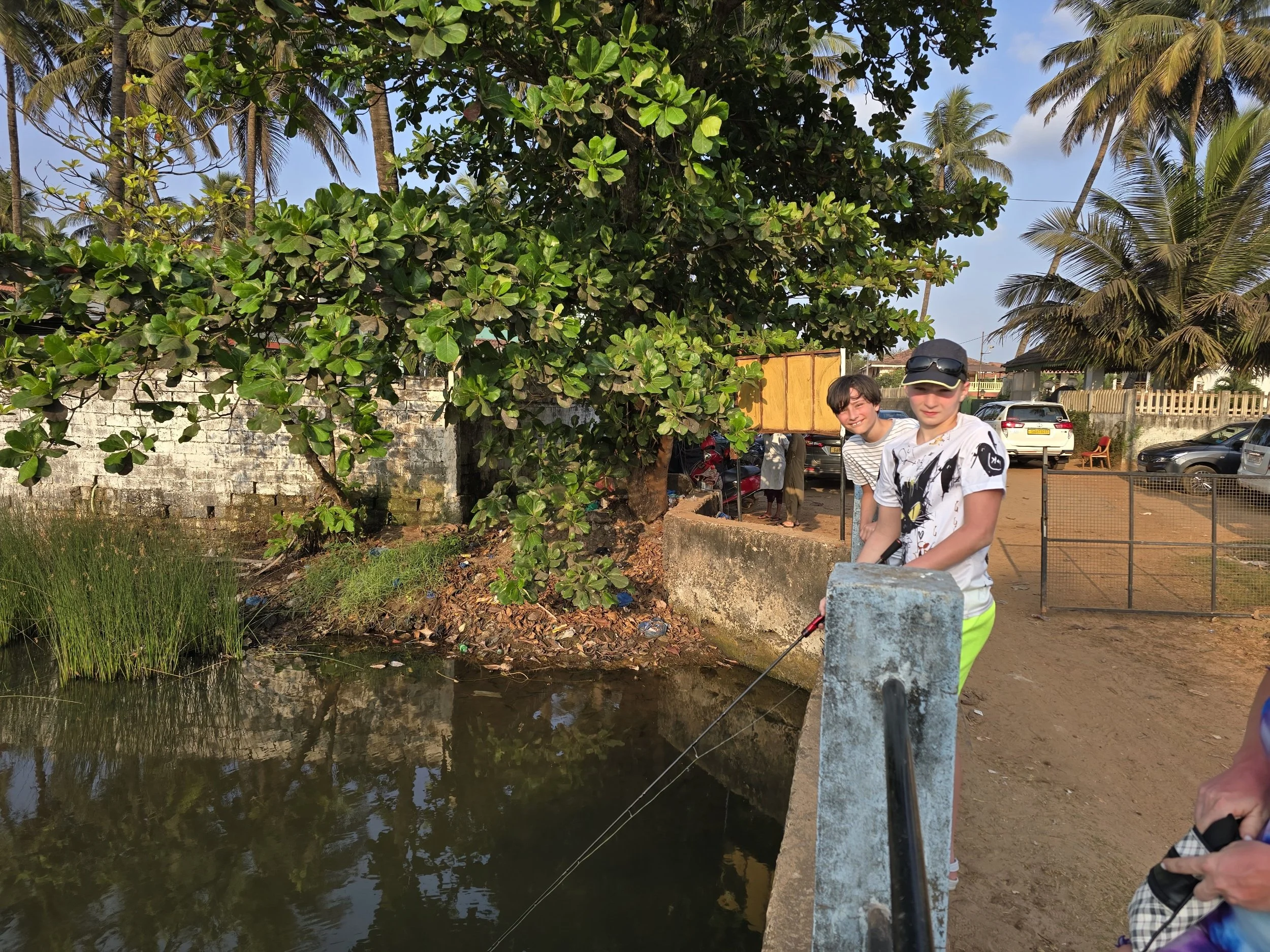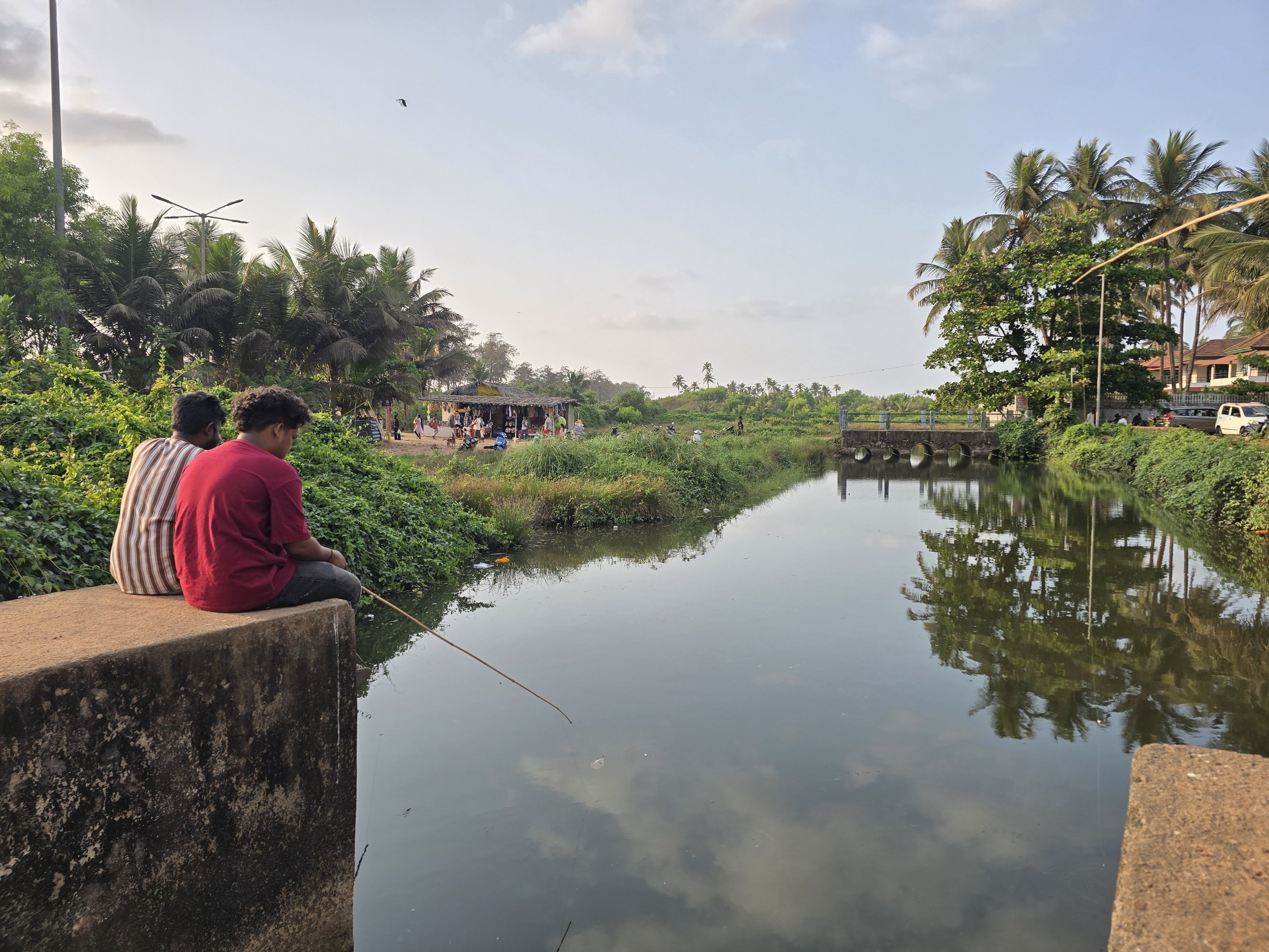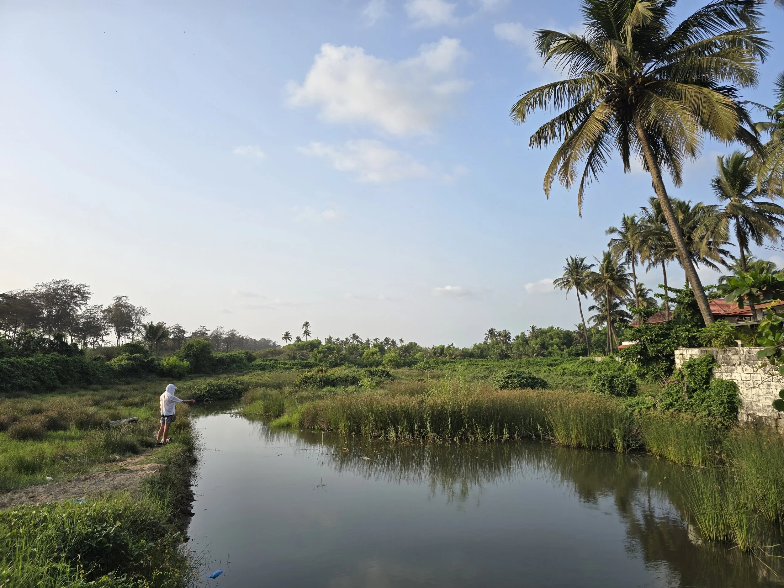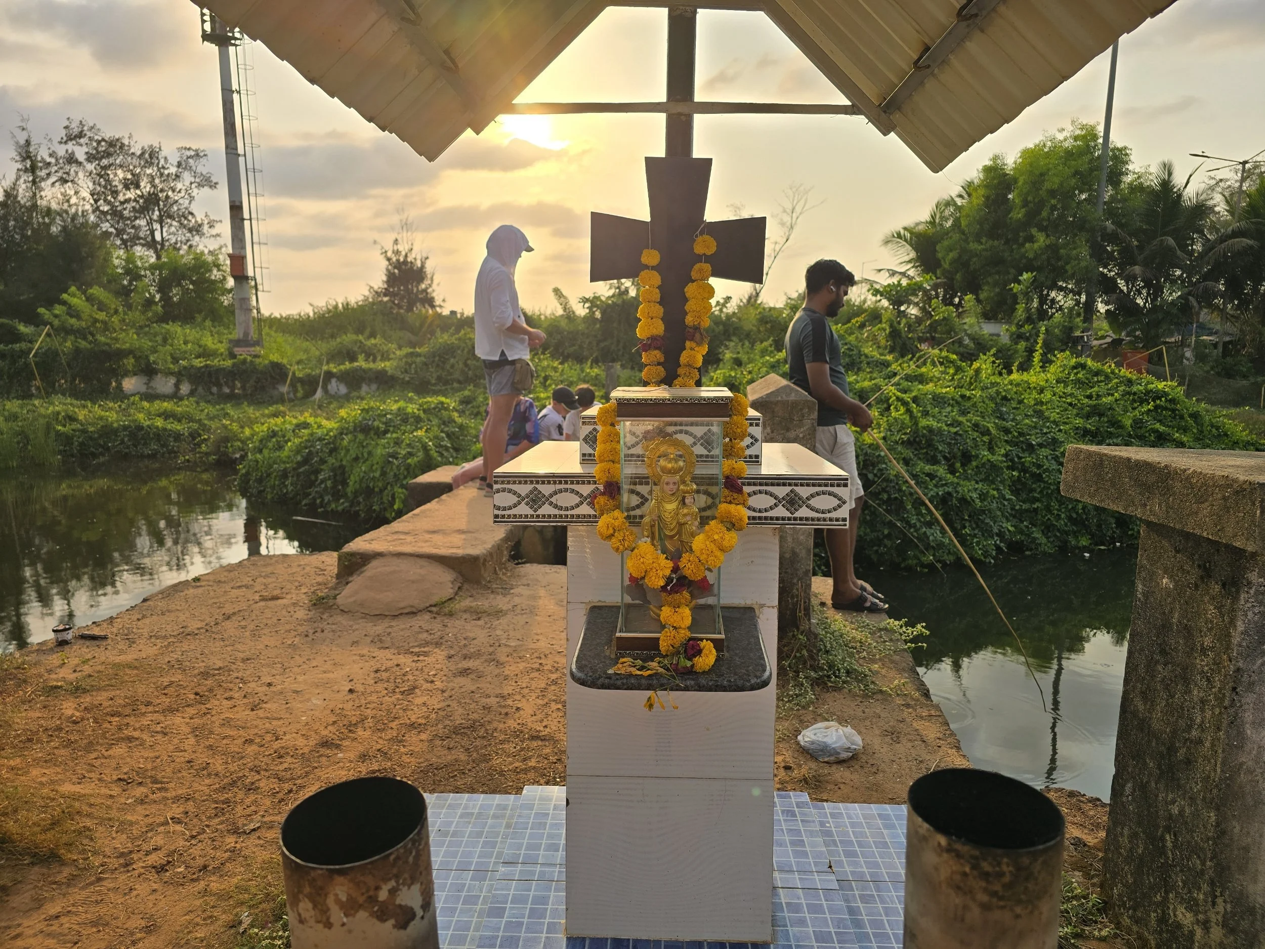 Then they invited us to go fishing. We walked just a few feet down the road, back towards the beach and to a very small river. There was a tiny bridge where a shrine to Mary and baby Jesus stood decorated in a necklace of marigolds. A few locals were fishing with bamboo sticks and just dropping down their lines with hooks on the ends. They caught several small fish while we were walking up. Unfortunately, Fierce's sunburn was starting to bug him, so he and I left our friends to enjoy their fishing adventure. I would never have thought of doing that or even known it was there to do, so I am super glad to have experienced fishing with the locals even just for a short time.