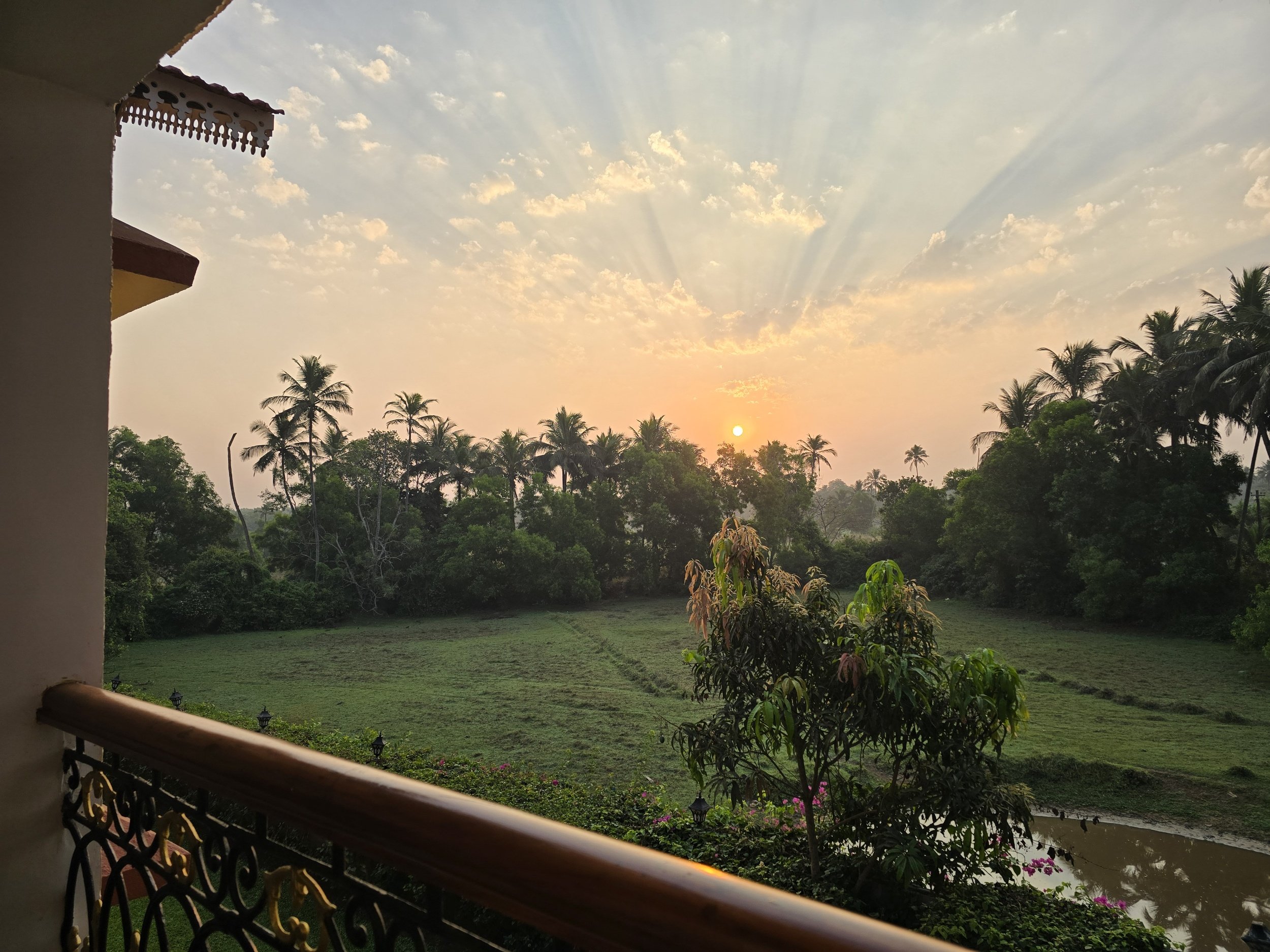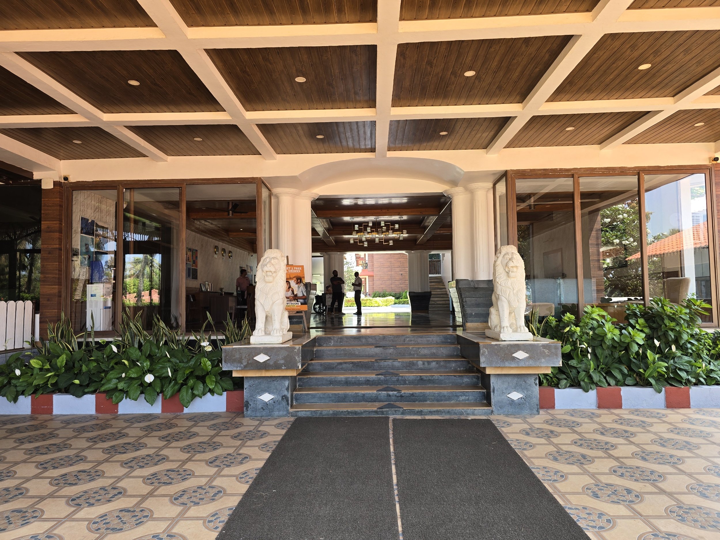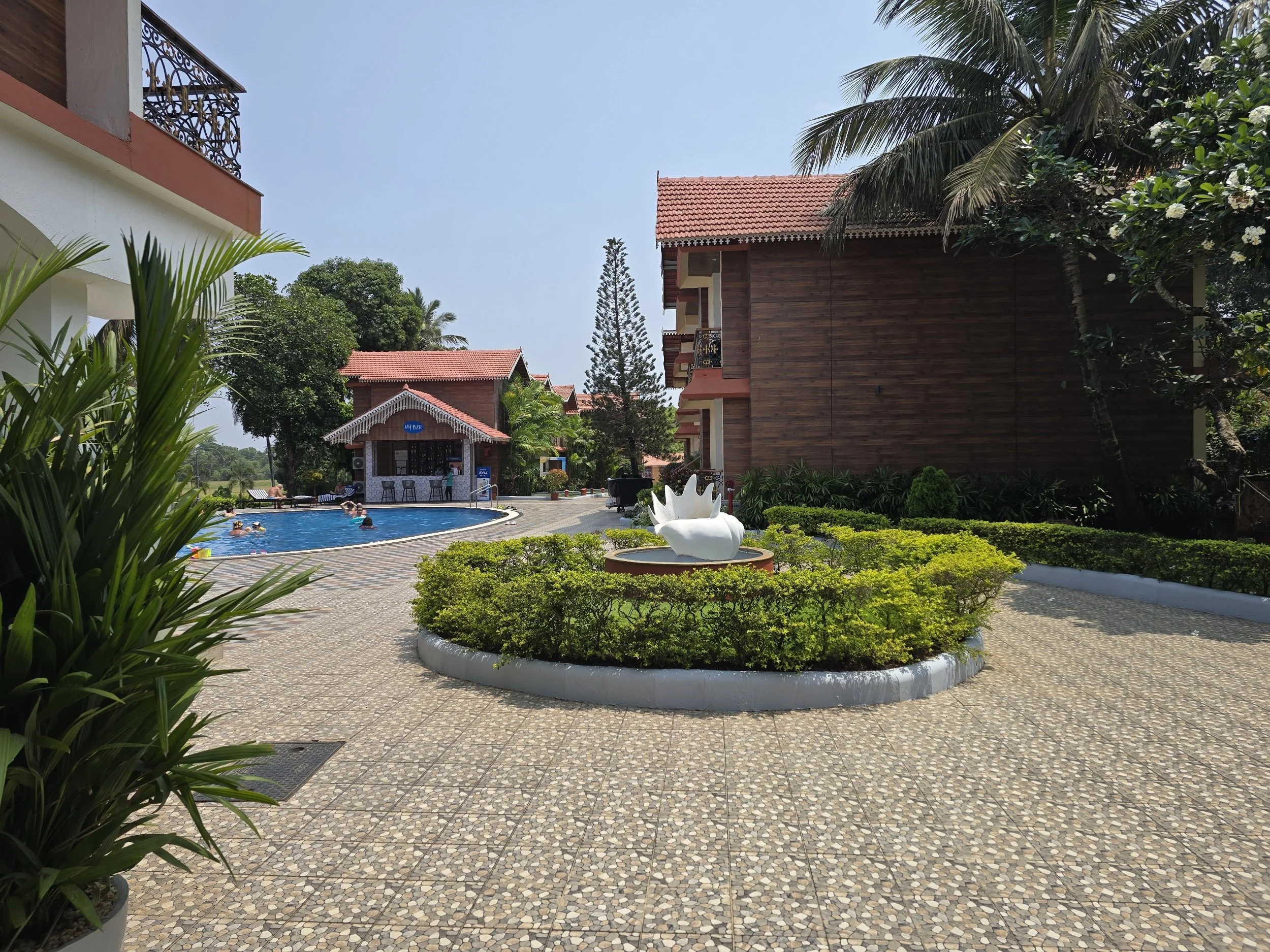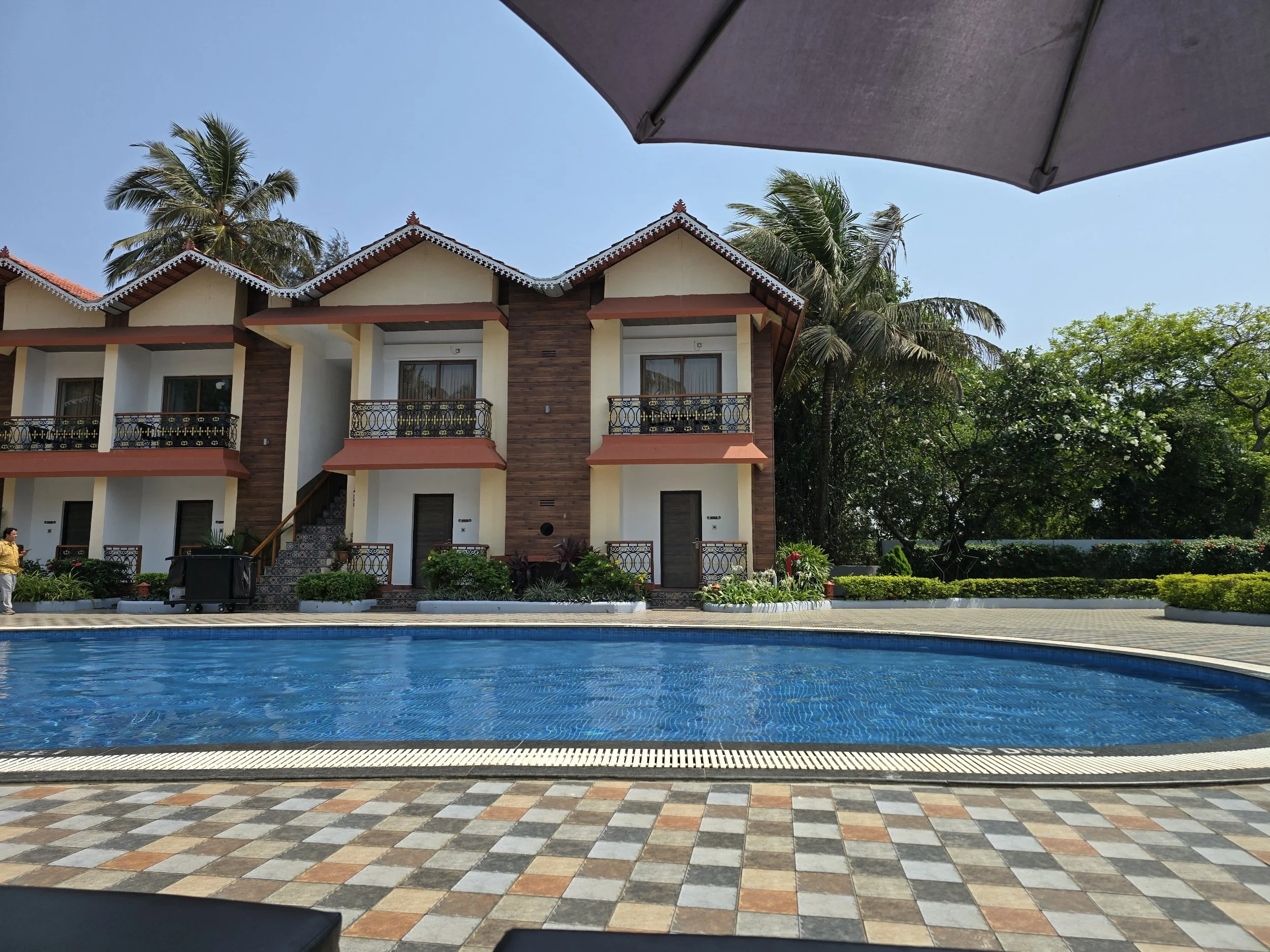 I cannot describe the delight Fierce and I felt when we pulled up to our Resort in Goa. Stone steps lead up to a semi open-aired reception with the hint of a pool just beyond. Someone brought a berry drink to welcome us which just added that light touch that says you can relax here.