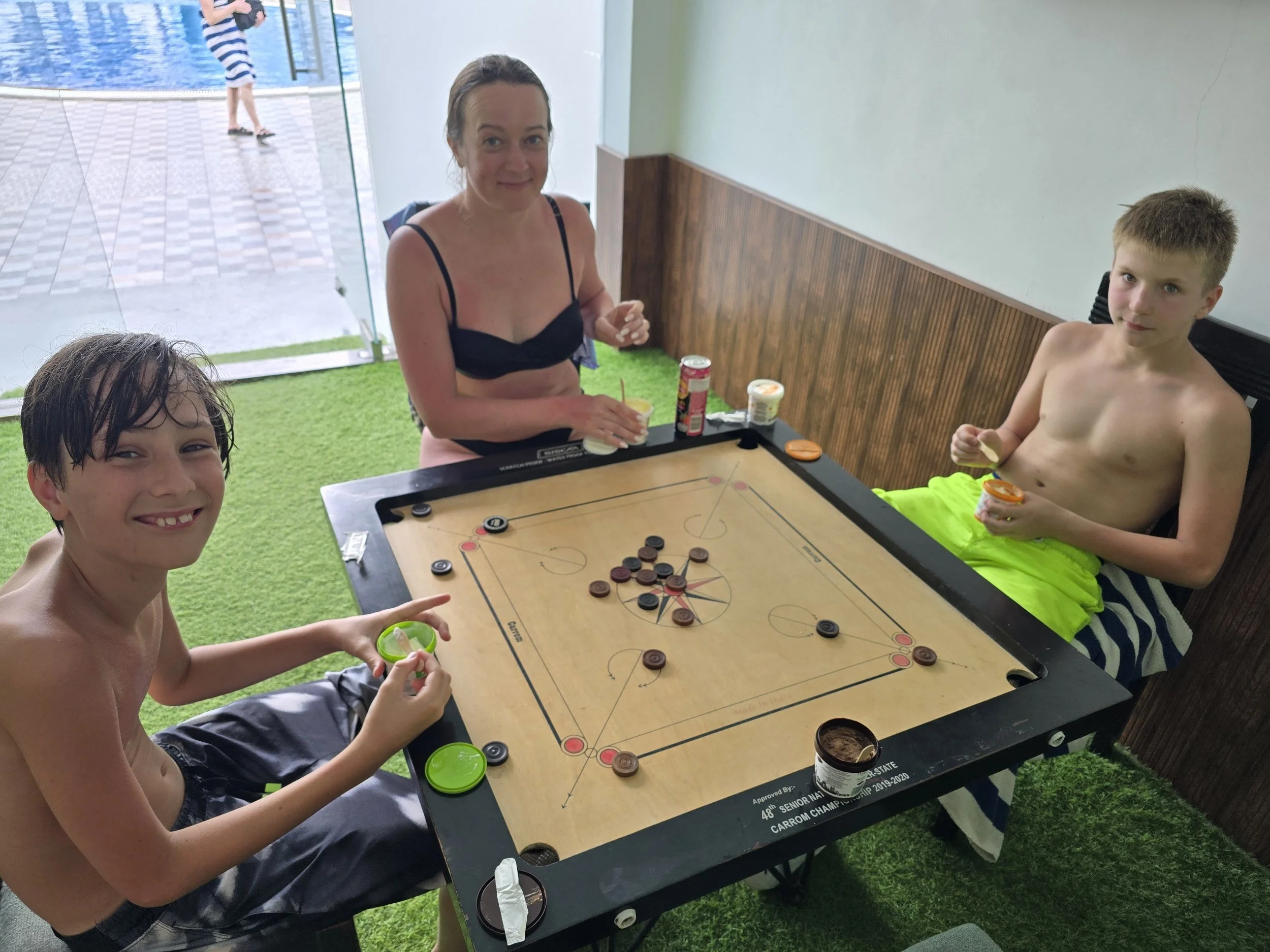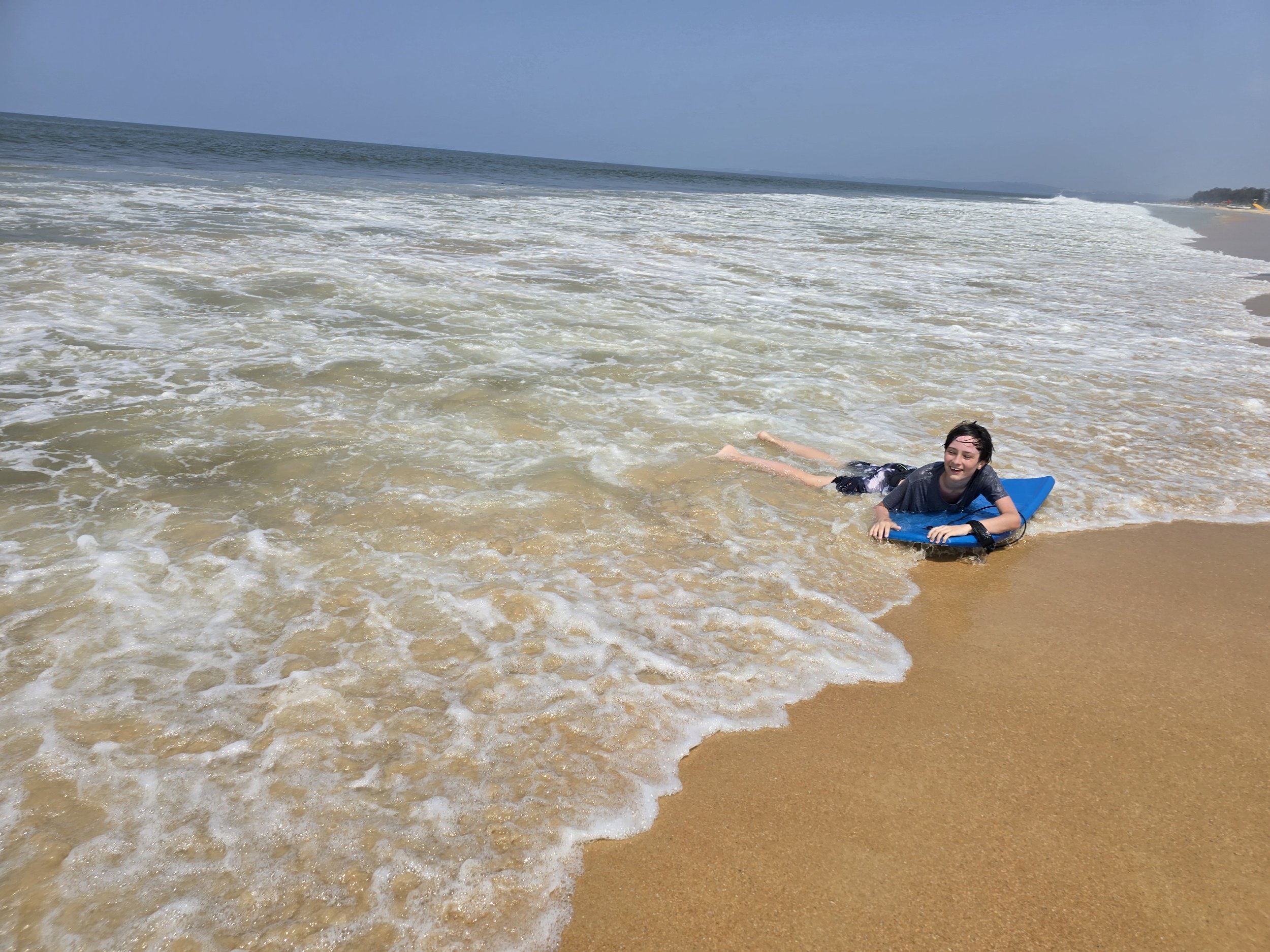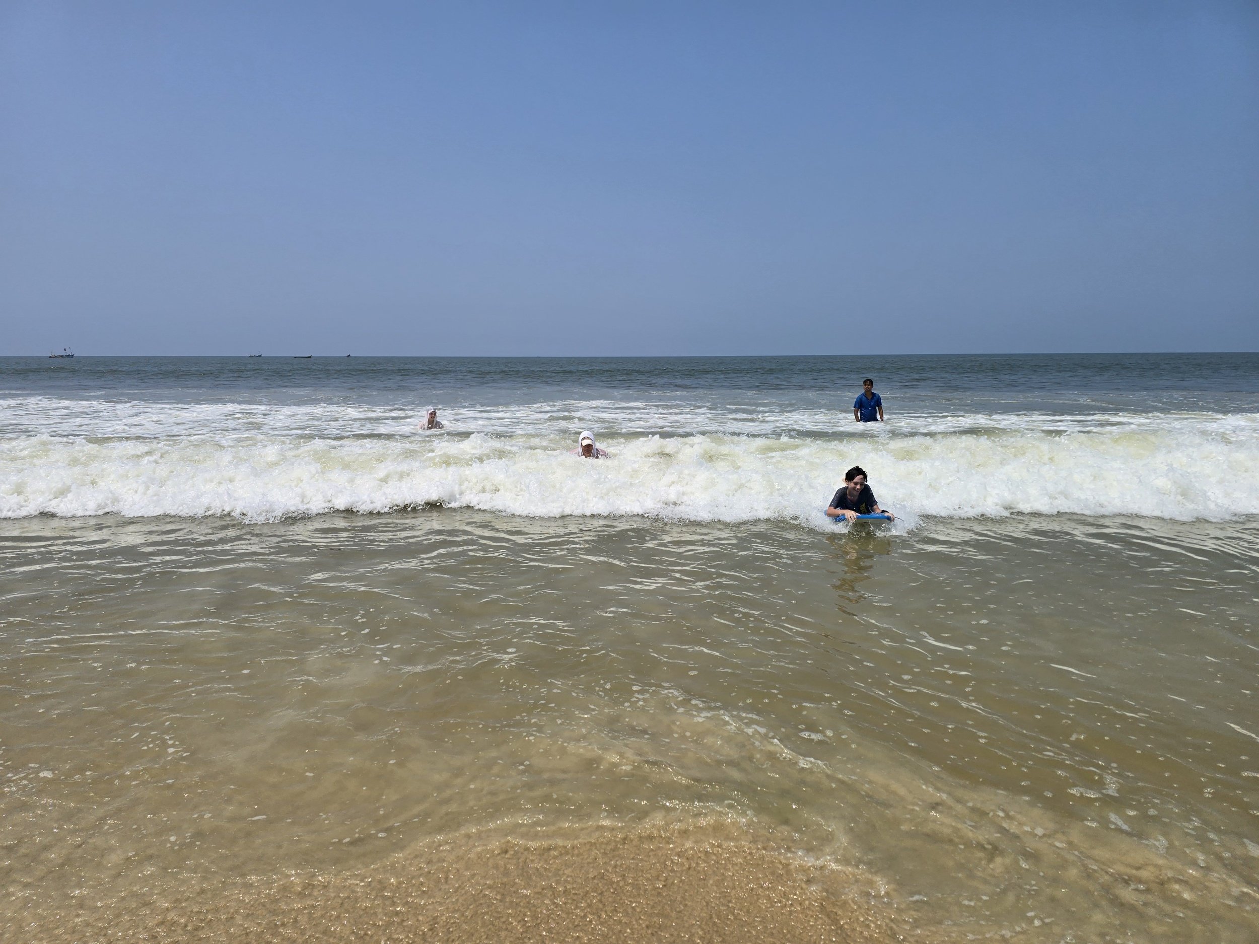 Fierce woke up chattier than ever and said he was feeling good. I didn't have a plan past breakfast and asked the Lord for a really fun day. We saw our Russian friends at the buffet and they invited us to join them at the beach. A half an hour later they were showing us where to find boards to surf the waves. The boys were in their glory. Even the adults took a couple of turns and it was so much fun. Fierce smiled the whole wave into shore and kept running back for more. We sat under umbrellas later and ordered appetizers. I got the boys virgin pina coladas which seemed to add just a little sparkle to the already wonderful day. Afterwards, the boys built sand castles and then our friends suggested we go back to the resort to play an Indian game. It was called Carrom and although it's on a square card table, the rules are a lot like pool. You flick a round chip against others and try to get your color in the corners of the table where they fall through a hole into a net. Their family even got everyone some Indian flavored ice cream, which included cashew, pistachio, fruit punch, muskmelon and pineapple-Yum! We kept the fun going and jumped in the pool for a bit which felt amazing after being in the salt water earlier.