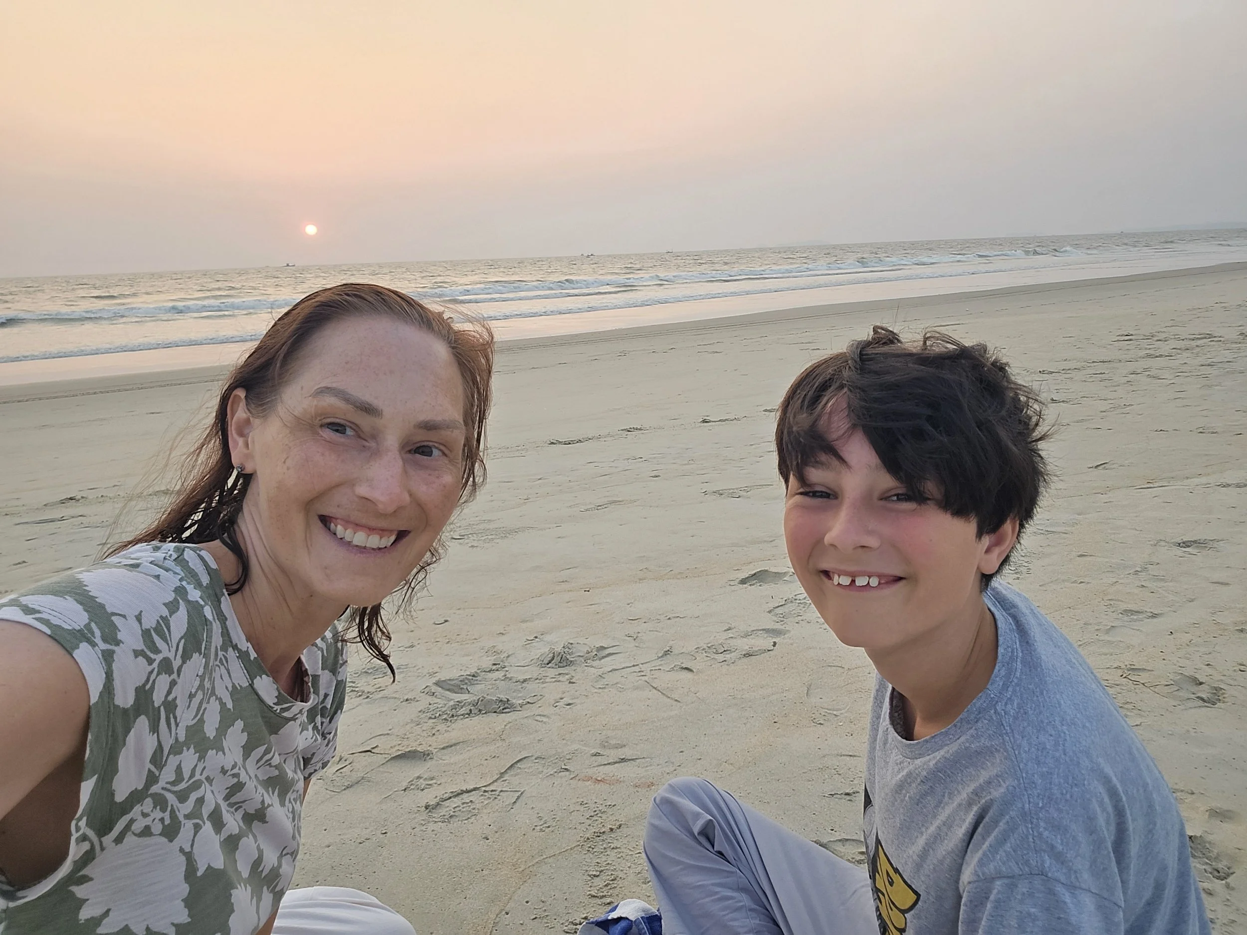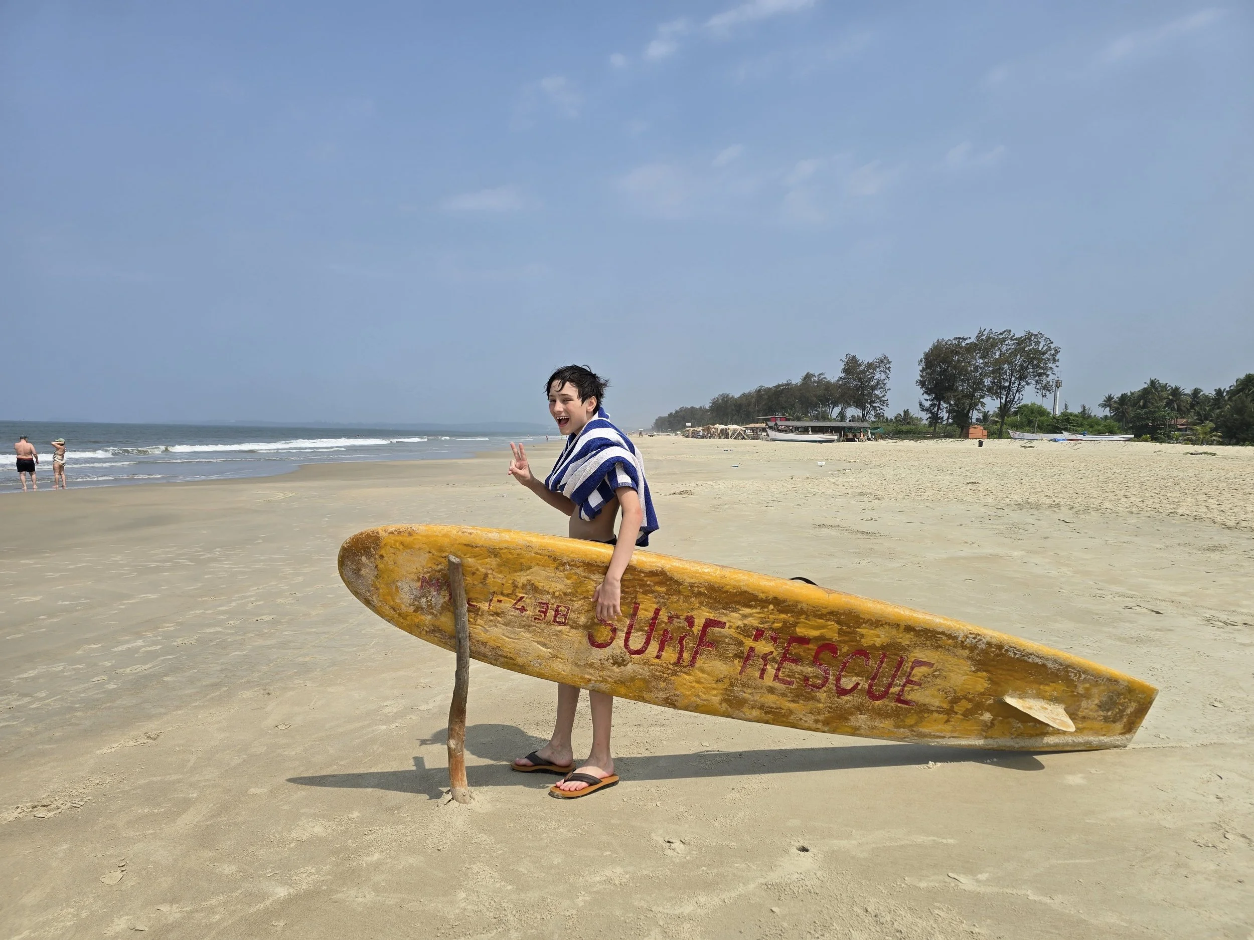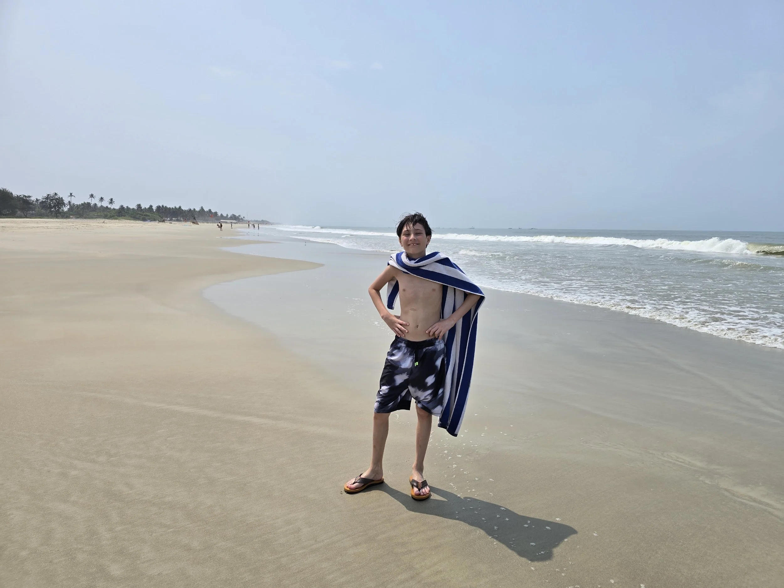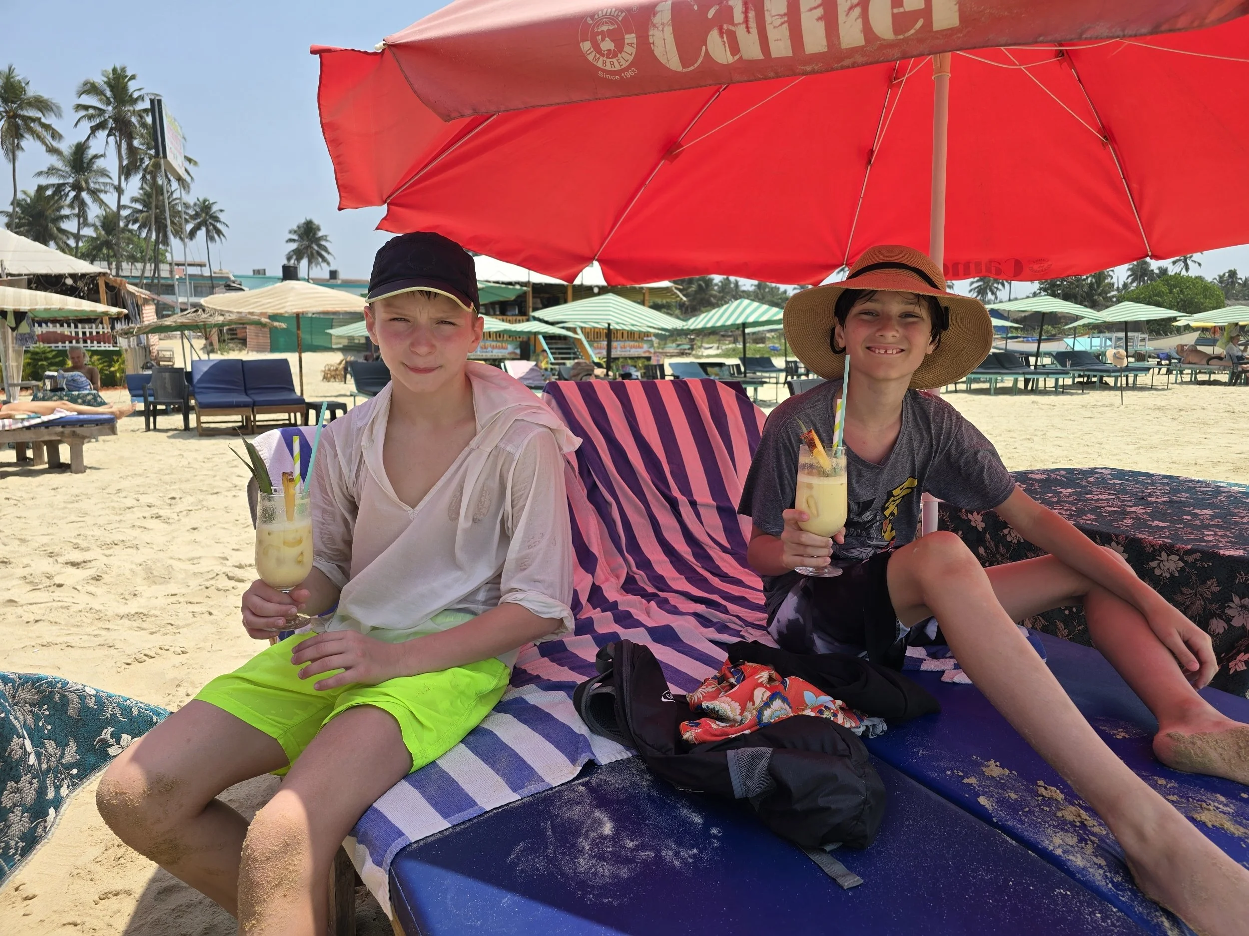 Fierce woke up chattier than ever and said he was feeling good. I didn't have a plan past breakfast and asked the Lord for a really fun day. We saw our Russian friends at the buffet and they invited us to join them at the beach. A half an hour later they were showing us where to find boards to surf the waves. The boys were in their glory. Even the adults took a couple of turns and it was so much fun. Fierce smiled the whole wave into shore and kept running back for more. We sat under umbrellas later and ordered appetizers. I got the boys virgin pina coladas which seemed to add just a little sparkle to the already wonderful day. Afterwards, the boys built sand castles and then our friends suggested we go back to the resort to play an Indian game. It was called Carrom and although it's on a square card table, the rules are a lot like pool. You flick a round chip against others and try to get your color in the corners of the table where they fall through a hole into a net. Their family even got everyone some Indian flavored ice cream, which included cashew, pistachio, fruit punch, muskmelon and pineapple-Yum! We kept the fun going and jumped in the pool for a bit which felt amazing after being in the salt water earlier.