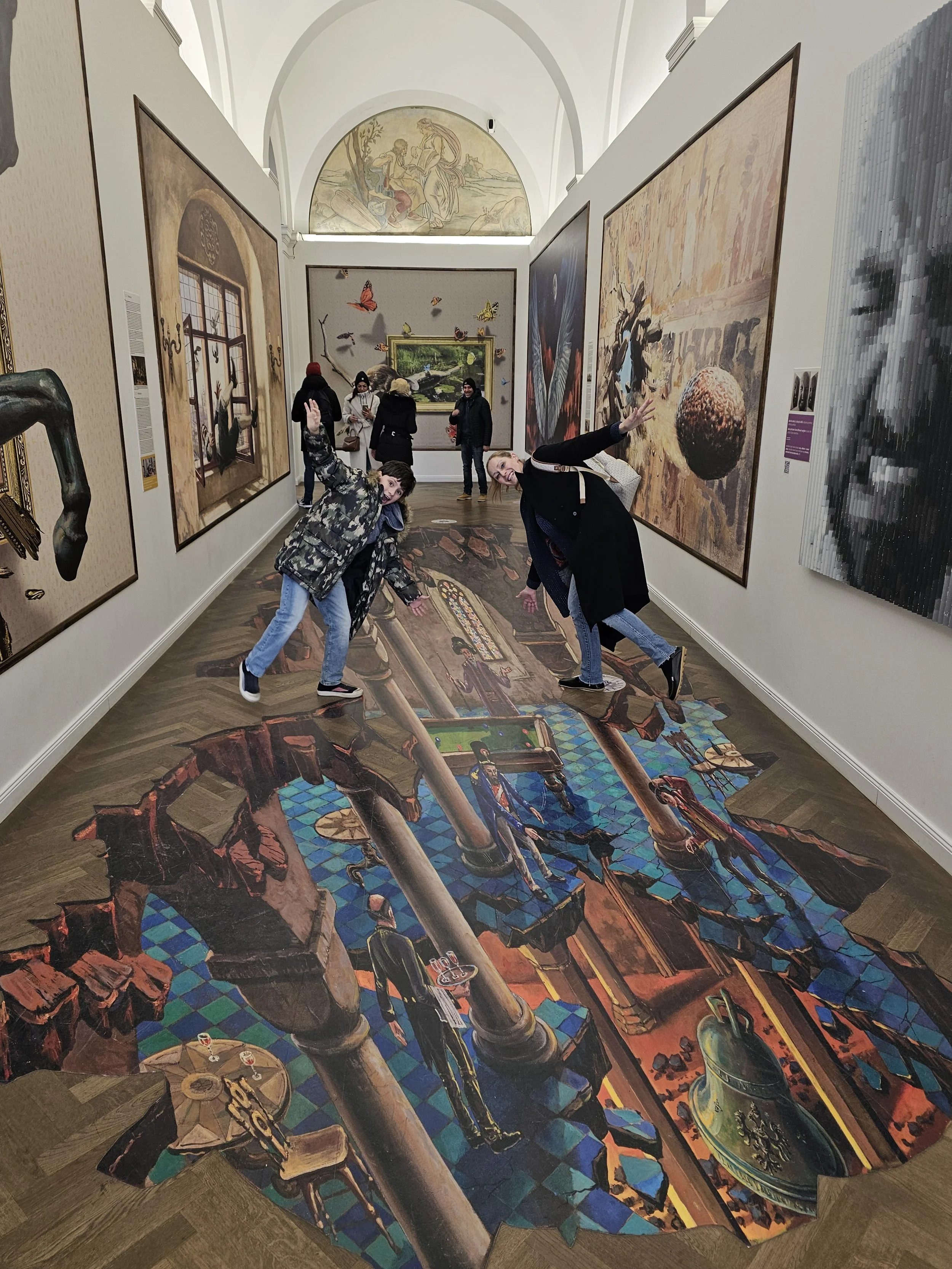 This was all a lot to take in, so as we walked back to town, I decided to pick a tourist destination that was a bit light-hearted. We went to the Illusion Museum and this was really fun. Every piece of art was interactive. When you buy your tickets, the lady smiles and says, “Take lots of pictures!” We pushed someone out a window, were blasted away by a meteor, fed a dear and Fierce was even knighted.